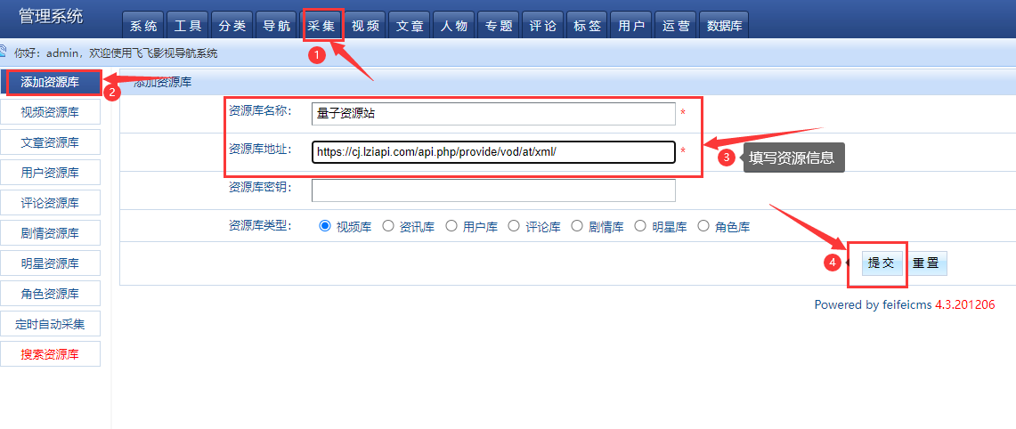 请按以下步骤进行:依次点击【采集】-【添加资源库】,然后依次输入