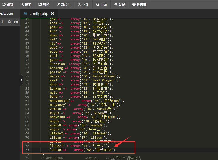 修改Lib/Conf/config.php,在列表最后添加两行: